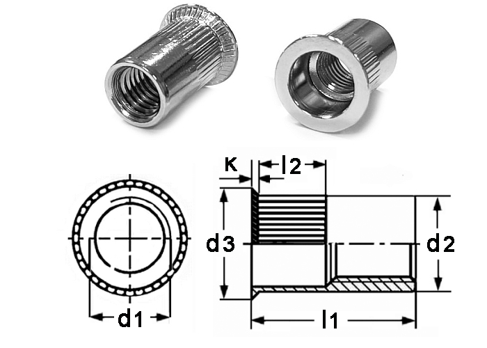 Preview: 25 Stk Einnietmuttern M3x9 mit Senkkopf, Rundschaft offen, gerändelt, Edelstahl A2